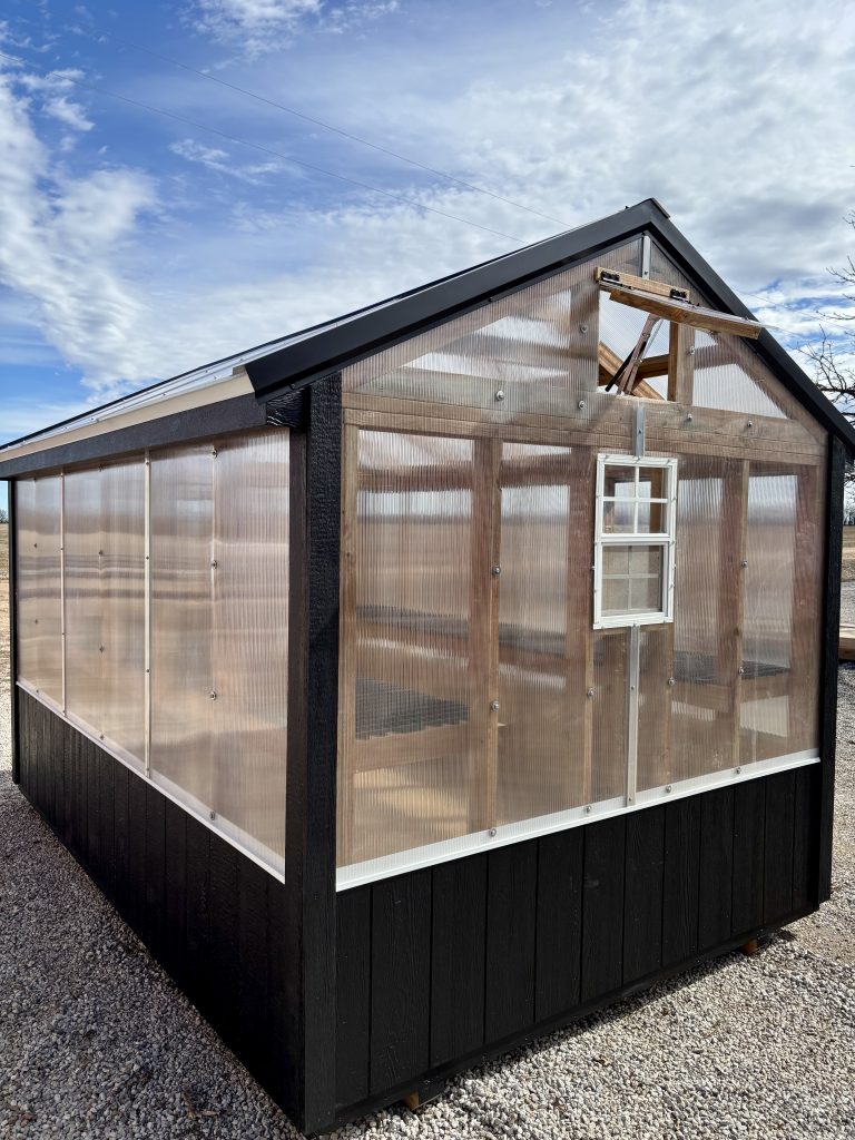 Our greenhouses are made with insulated 8 mm polycarbonate materials. Standard comes with an automatic gas shock opener and shelving inside.